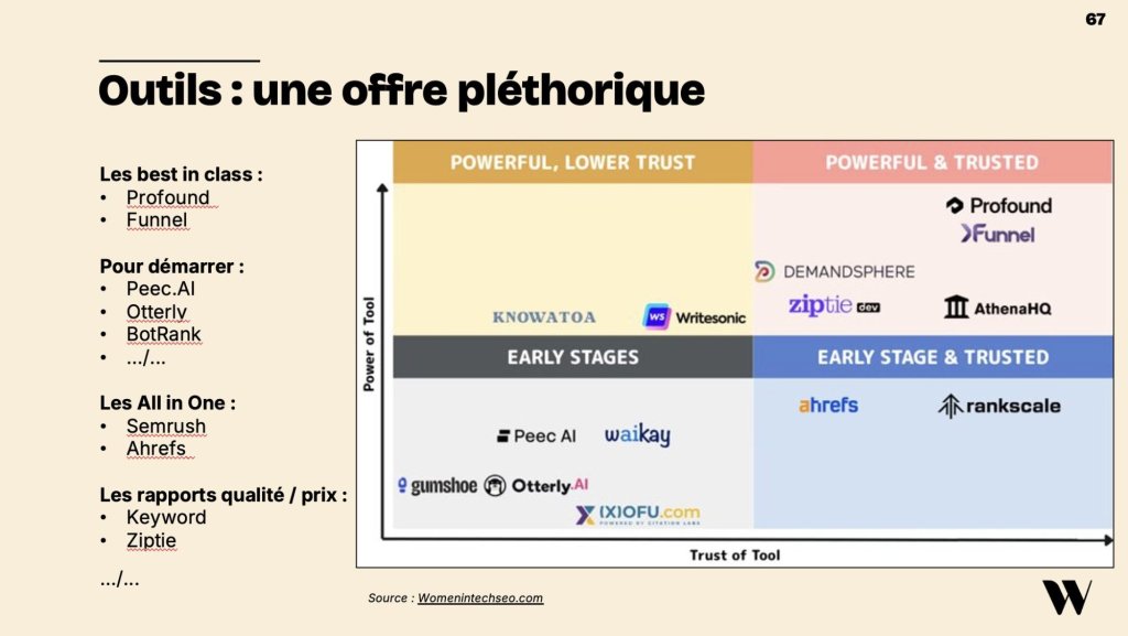 | Pour démarrer | Peec.AI, Otterly, BotRank (lyonnais), Gumshoe |